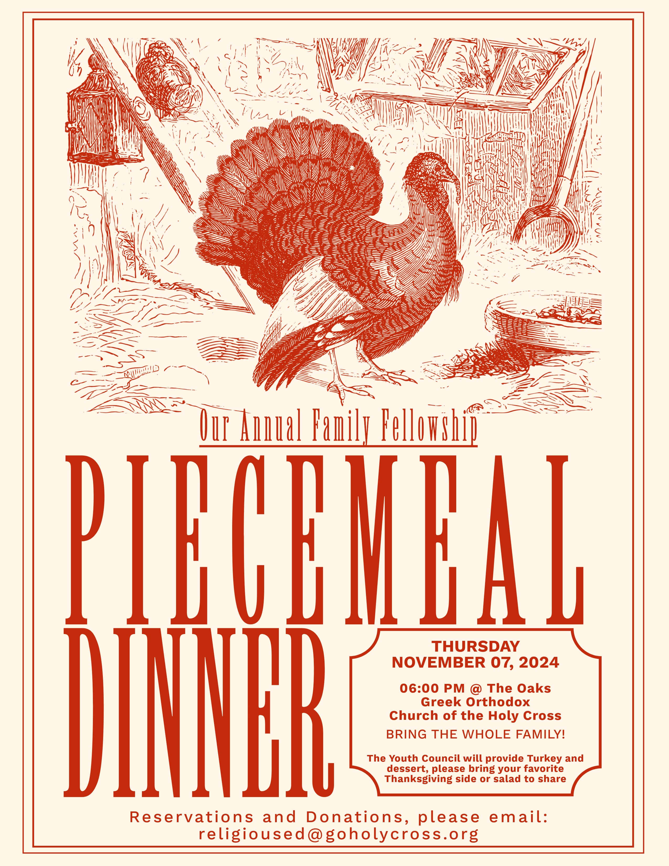 Join us at 6:30 PM. If your “piece” will be a turkey, please bring to church kitchen by Sunday, November 10. Youth Council will be providing the dessert pieces. Please email Kathy Roque at kathyroquealbert@gmail.com to let us know which Piece you will be bringing. If you would like to help with set up, please let Presvytera Nikki (psalmas@aol.com) know.