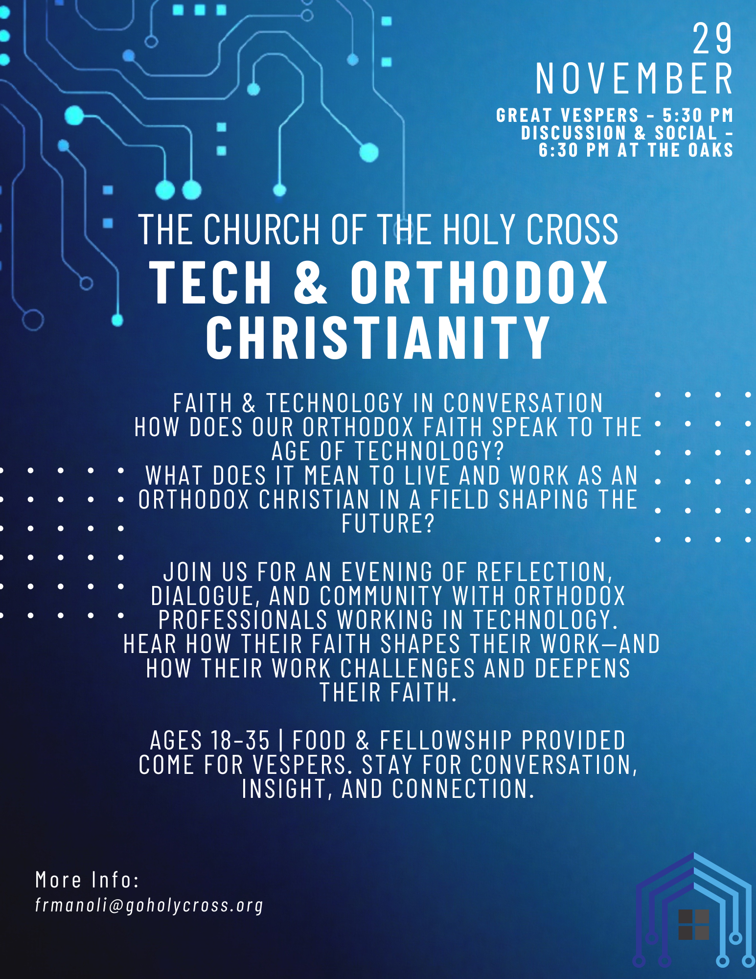 We'll start with Great Vespers at 5:30 PM, then Discussion & Social at 6:30 PM at The Oaks. The subject is "Tech & Orthodox Christianity - Faith & Technology in Conversation." How does our Orthodox faith speak to the age of technology? What does it mean to live and work as an Orthodox Christian in a field shaping the future? Join us for an evening of reflection, dialogue, and community with Orthodox professionals working in technology. Hear how their faith shapes their work—and how their work challenges and deepens their faith. Ages 18–35 | Food & Fellowship provided. Come for Vespers. Stay for conversation, insight, and connection. For info, please contact Father Manoli, or click here for the event flyer.
